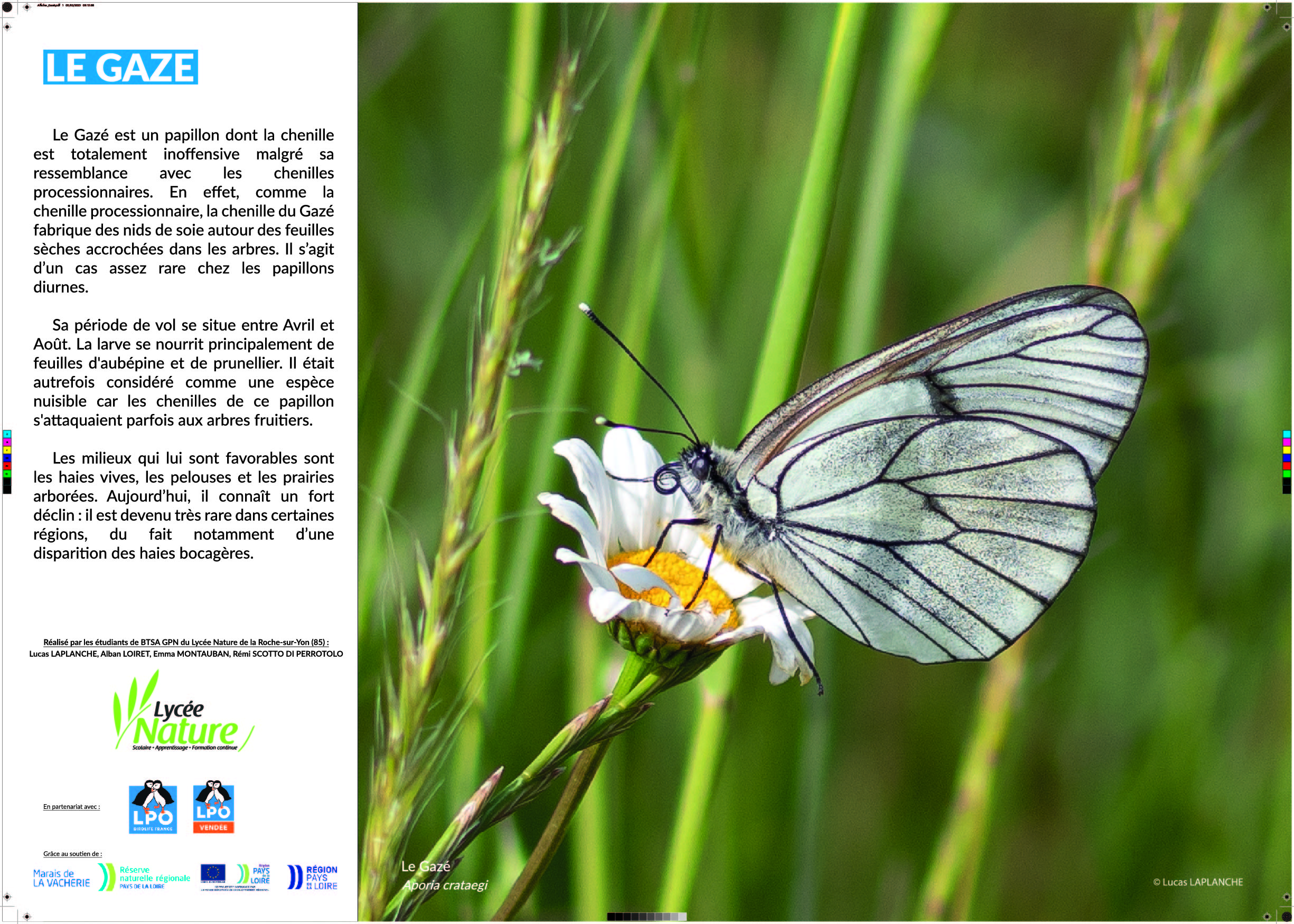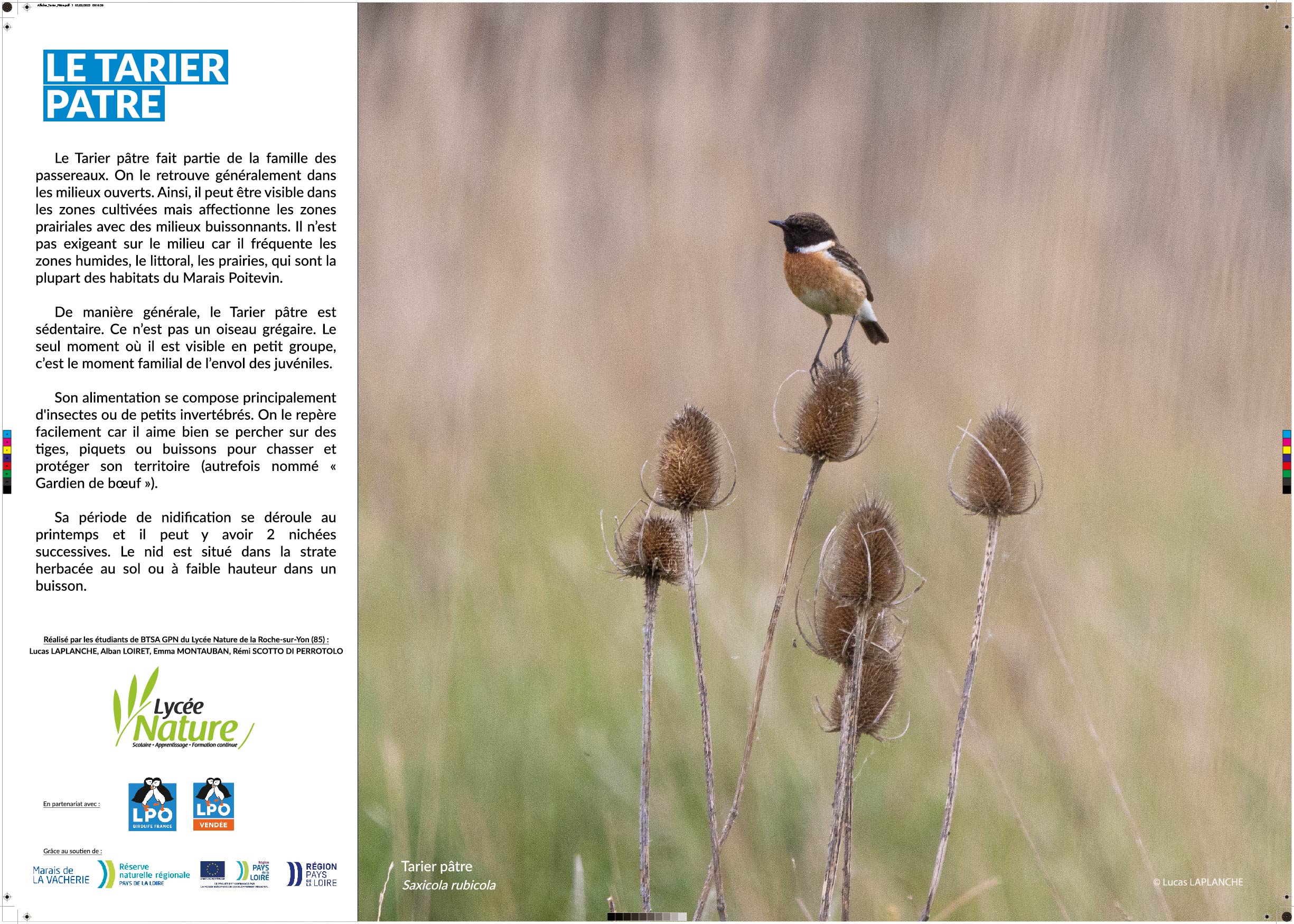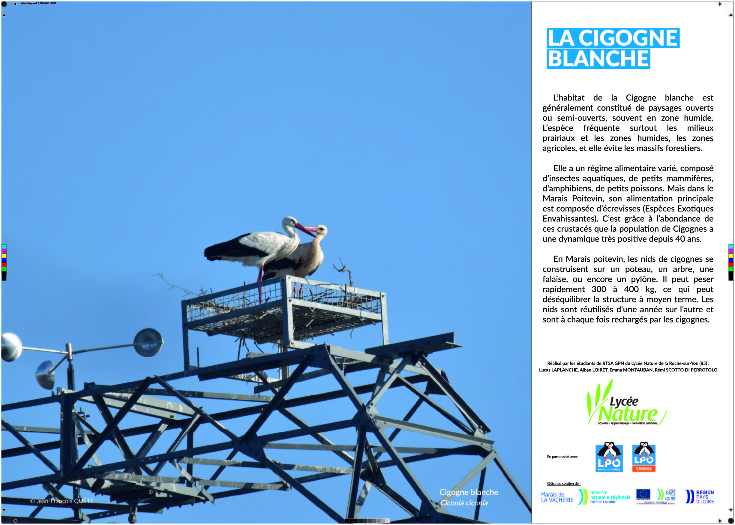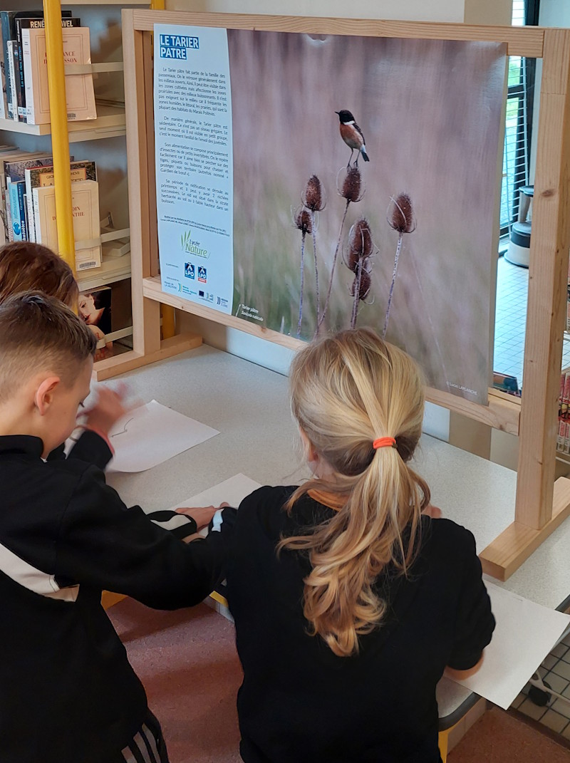 Grâce aux différentes photographies que j’ai réalisées sur le terrain, nous avons décidé de nous lancer dans la création d’une petite exposition photographique à but pédagogique et informatif. Une animation a ensuite été réfléchie, en lien avec l’exposition, à destination des classes de primaire de la commune de Champagné-les-Marais.