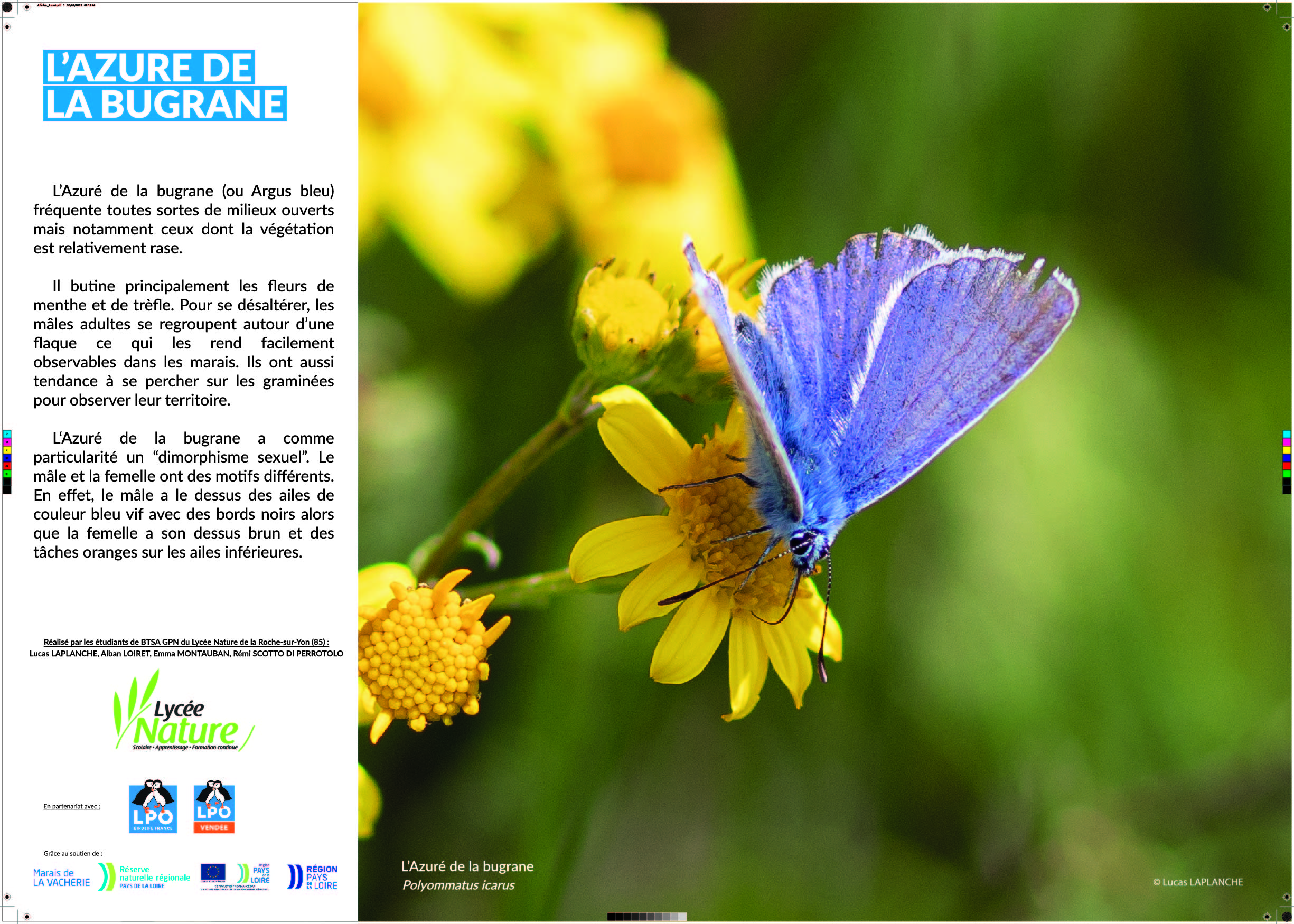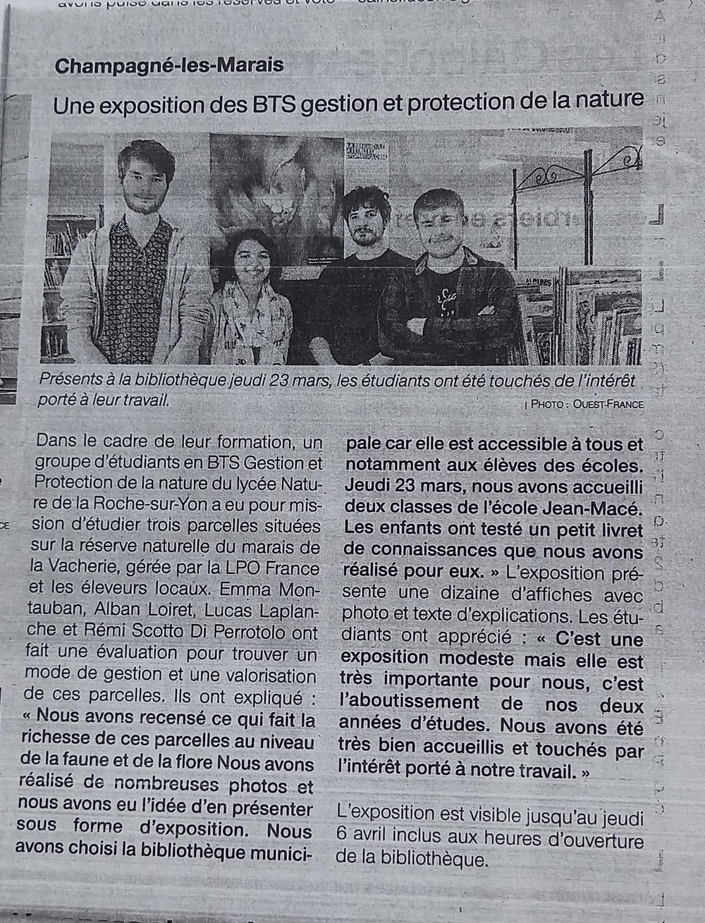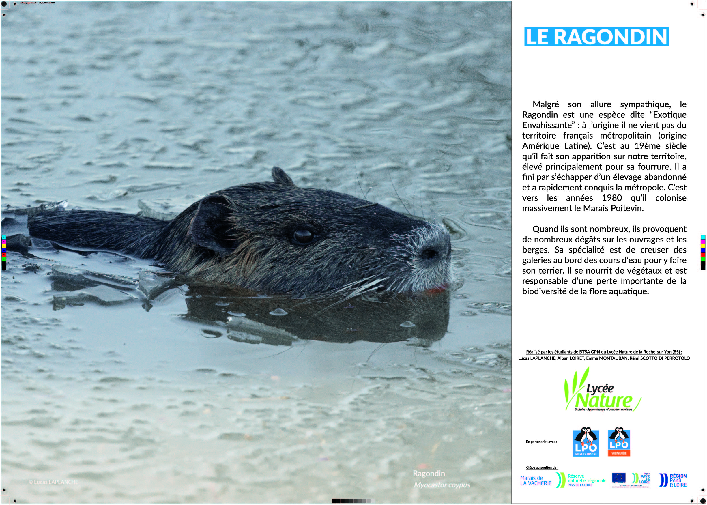 Grâce aux différentes photographies que j’ai réalisées sur le terrain, nous avons décidé de nous lancer dans la création d’une petite exposition photographique à but pédagogique et informatif. Une animation a ensuite été réfléchie, en lien avec l’exposition, à destination des classes de primaire de la commune de Champagné-les-Marais.